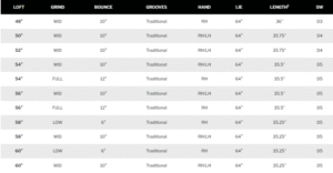 Loft & Bounce | 48°/10° (MID GRIND), 50°/10° (MID GRIND), 52°/10° (MID GRIND), 54°/10° (MID GRIND), 54°/12° (FULL GRIND), 56°/10° (MID GRIND), 56°/12° (FULL GRIND), 58°/6° (LOW GRIND), 58°/10° (MID GRIND), 60°/6° (LOW GRIND), 60°/10° (MID GRIND) |